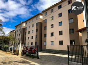 Sala, 2 quartos, banho social com blindex, cozinha conjugada com área de serviço e uma vaga de estacionamento.